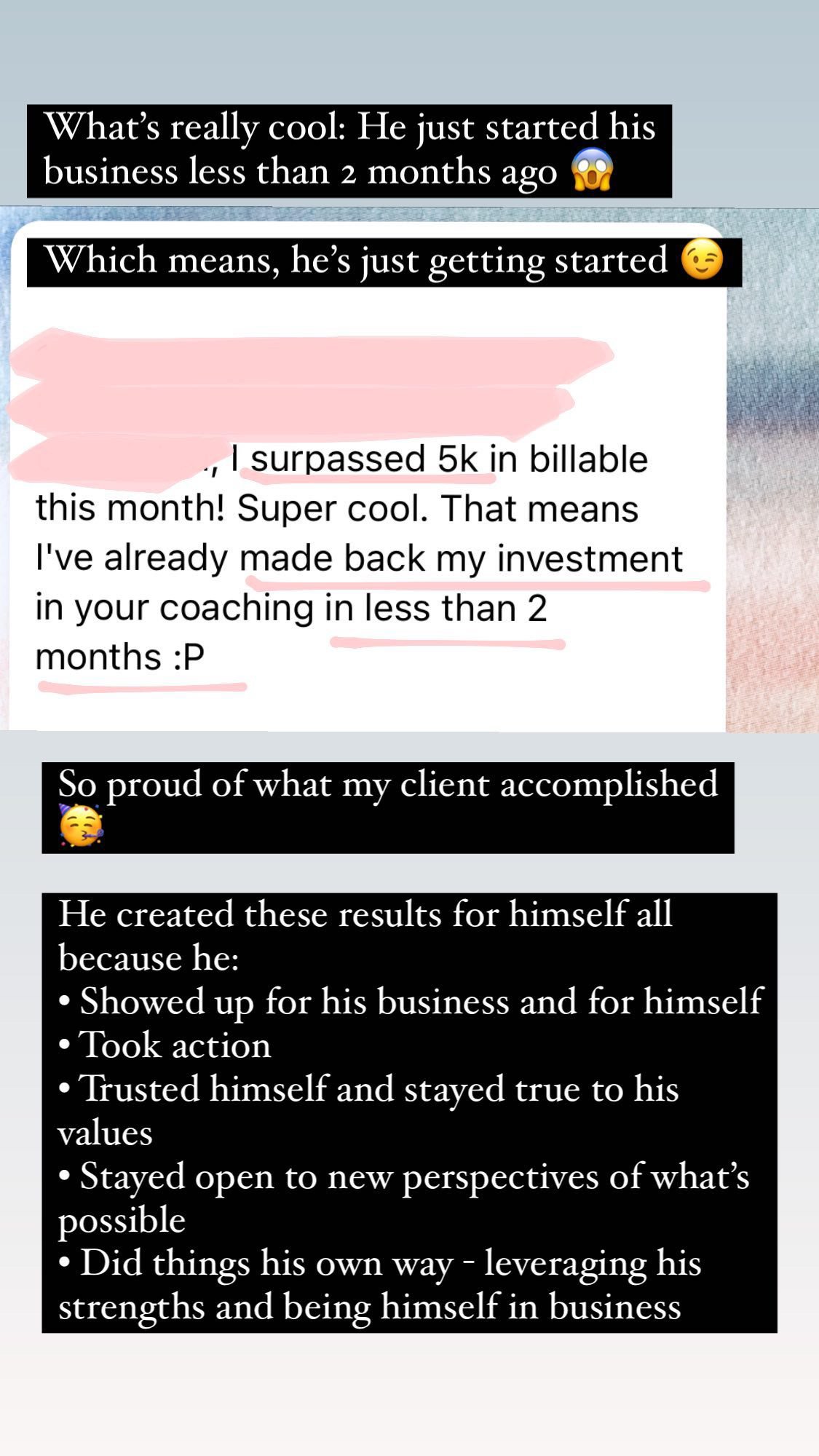 *Esther’s Note: Full disclosure on why I asked Joshua why he didn’t aim higher. Based on his answers on the coaching application form and website, he was already working with clients and telling others about his business.